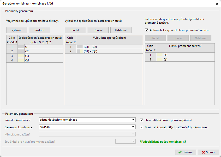 Dialogové okno "Generátor kombinací - 1. řád" umožňuje hromadnou tvorbu kombinací zatěžovacích stavů na základě zadaných kombinačních pravidel. S ohledem na charakter normy EN 1990 může být počet generovaných kombinací poměrně velký a v extrémních případech by mohl způsobit i výrazné zpomalení programu. Z tohoto důvodu je v pravém dolním rohu zobrazována informace o předpokládaném počtu kombinací, které budou vygenerovány. Uživatel tak může ještě před spuštěním generování zjistit, kolik kombinací bude vytvořeno, a případně upravit podmínky generátoru. Horní část okna slouží k zadávání podmínek pro generování kombinací, spodní obsahuje různá nastavení generátoru.