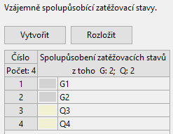 V této části je možné sloučit zatěžovací stavy, které mají vystupovat v kombinacích vždy společně. Do jedné skupiny nelze slučovat stálá a proměnná zatížení. Pokud je v Parametrech generátoru zaškrtnuté nastavení "Všechna stálá zatížení vždy v kombinaci", nemá vytváření skupin stálých ZS vliv na výskyt v kombinacích, neboť každá vygenerovaná kombinace bude obsahovat všechny stálé ZS. V takovém případě má slučování stálých ZS vliv pouze na uvažování příznivých/nepříznivých účinků ZS (pokud není zaškrtnuto "Stálá zatížení působí pouze nepříznivě").