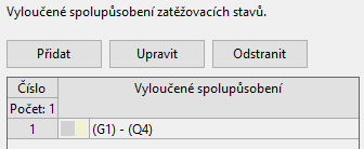 Vzájemné vyloučení | - | Lze zadat libovolný počet zatěžovacích stavů do jedné skupiny. Program v tomto případě nevygeneruje žádnou kombinaci, která obsahuje minimálně dva zatěžovací stavy z této skupiny. |