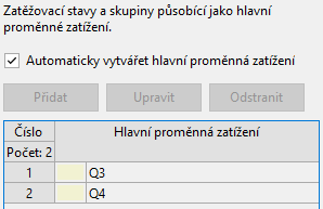 Tato část je dostupná pouze v případě zadávání zatížení dle EN 1990 (norma se volí v záložce "Materiály a normy"). V automatickém režimu je při vytváření kombinací každé proměnné zatížení použito jako hlavní. Pokud je vypnut automatický režim, je možné v seznamu hlavních proměnných zatížení provádět ruční úpravy. Lze například libovolný zatěžovací stav odstranit ze seznamu, takže nebude uvažován v kombinacích jako hlavní proměnné. Pokud se do seznamu přidá nová položka s více zatěžovacími stavy, budou všechny tyto zatěžovací stavy v těch kombinacích, kde se vyskytnou pohromadě, uvažovány jako hlavní.