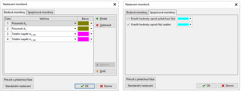 V dialogovém okně "Nastavení monitorů" lze nastavit veličiny, jejichž hodnoty se budou u daného monitoru zobrazovat (bodové monitory). Nastavení seznamu veličin, lze převzít z předchozí fáze budování pomocí tlačítka "Převzít z předchozí fáze". Standardně se zobrazují čtyři veličiny. Další veličinu lze do seznamu vložit pomocí tlačítka "Přidat". Pomocí tlačítka "Odstranit" lze veličinu ze seznamu smazat.