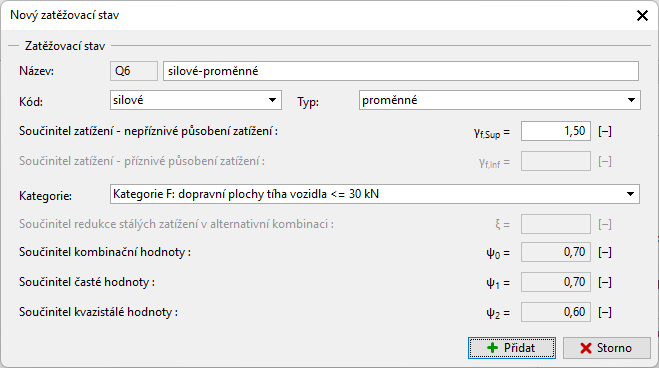 Zatřídění zatěžovacích stavů do kategorií odpovídá klasifikaci zatížení dle tabulky A1.1 normy EN 1990. Dle tohoto zatřídění jsou proměnným zatěžovacím stavům přiřazeny kombinační součinitele ψ0, ψ1 a ψ2. Kategorie "Uživatelské zadání" umožňuje zadání vlastních hodnot součinitelů. Výběr kategorie je dostupný pouze pro zatěžovací stavy zadané dle EN 1990 (norma se volí v záložce "Materiály a normy").