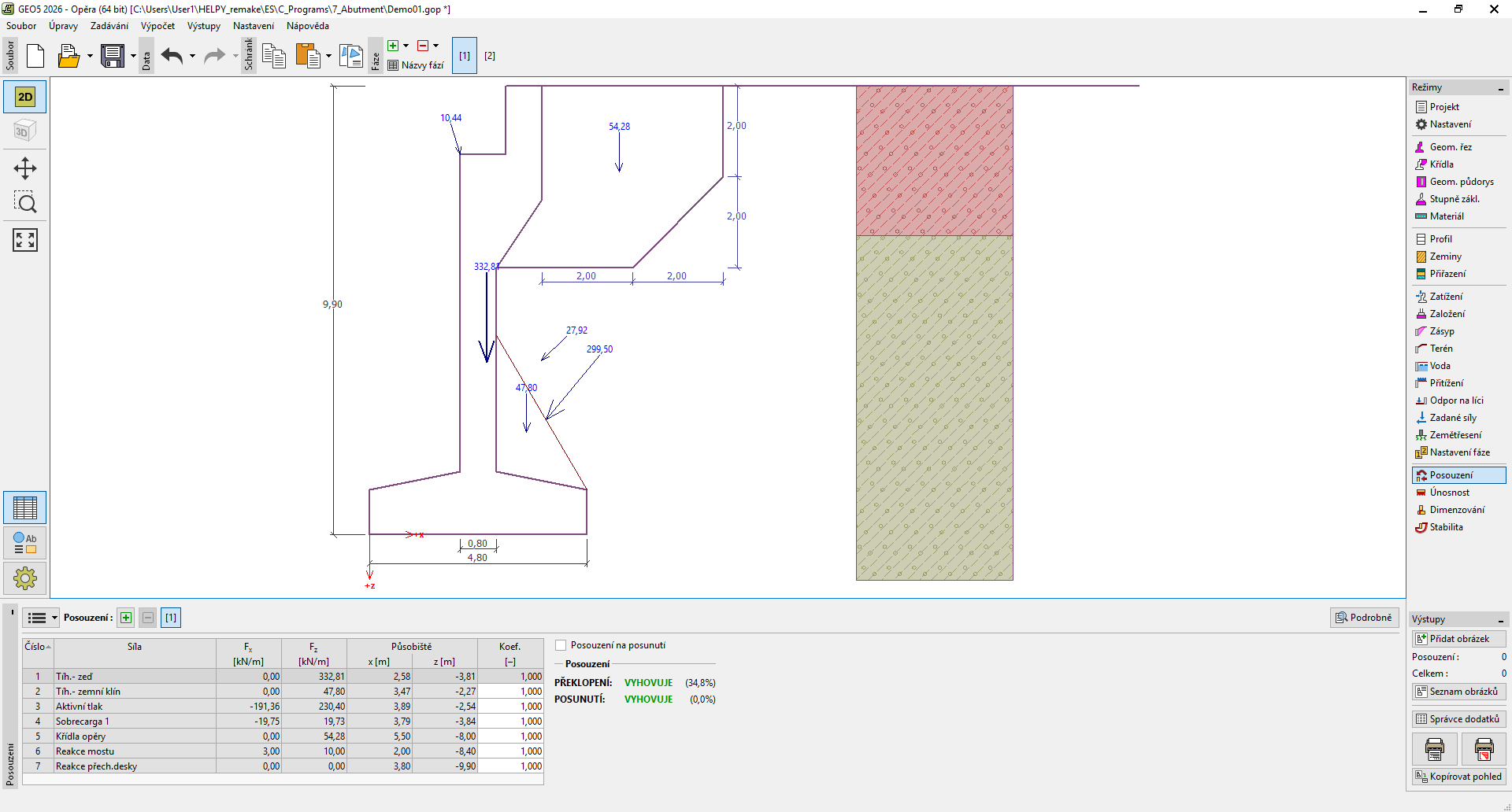 Spočtené síly působící na opěru jsou zobrazeny na desktopu a aktualizují se okamžitě při jakékoliv změně dat a nastavení v rámu. V pravé části rámu se zobrazuje výsledek posouzení zdi na překlopení a posunutí. Tlačítko "Podrobně" otevírá dialogové okno, které obsahuje detailní výpis výsledků posouzení.