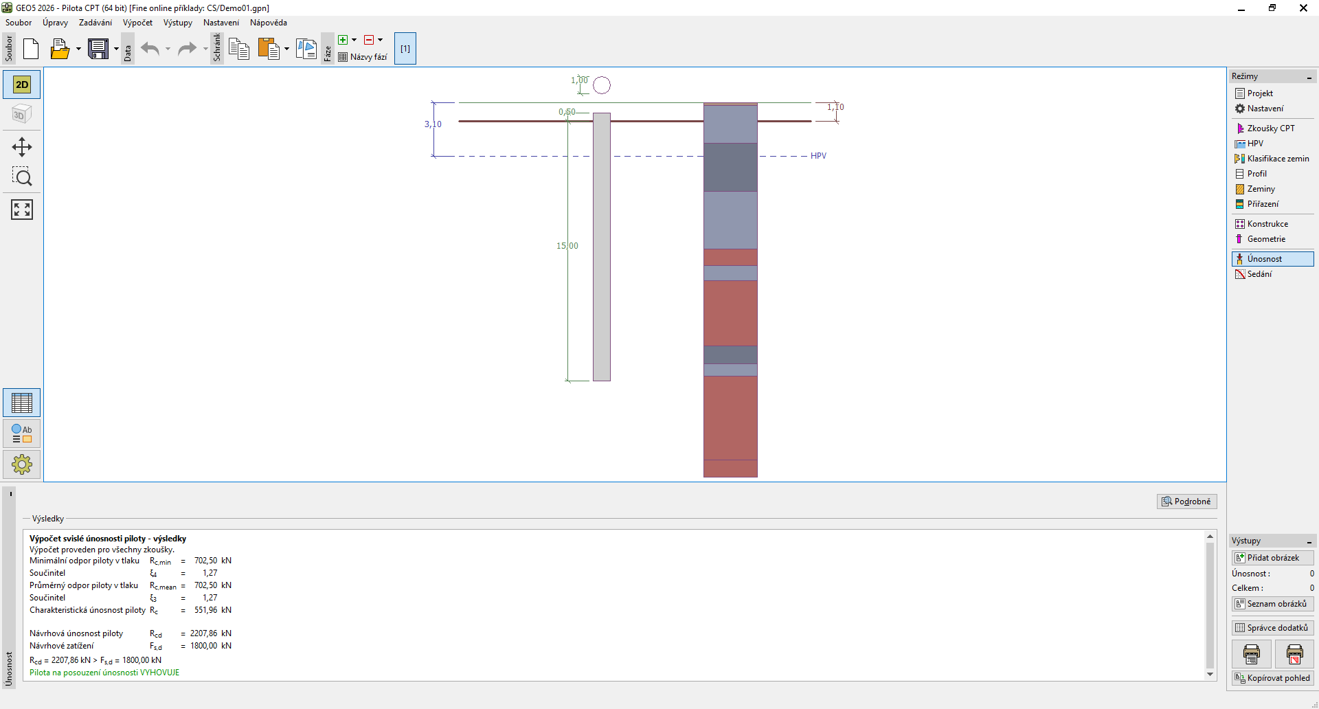 V rámu "Únosnost" se posuzuje svislá únosnost piloty. Výsledky výpočtu jsou zobrazeny v dolní části rámu. Tlačítko "Podrobně" otevírá dialogové okno, které obsahuje detailní výpis výsledků posouzení.