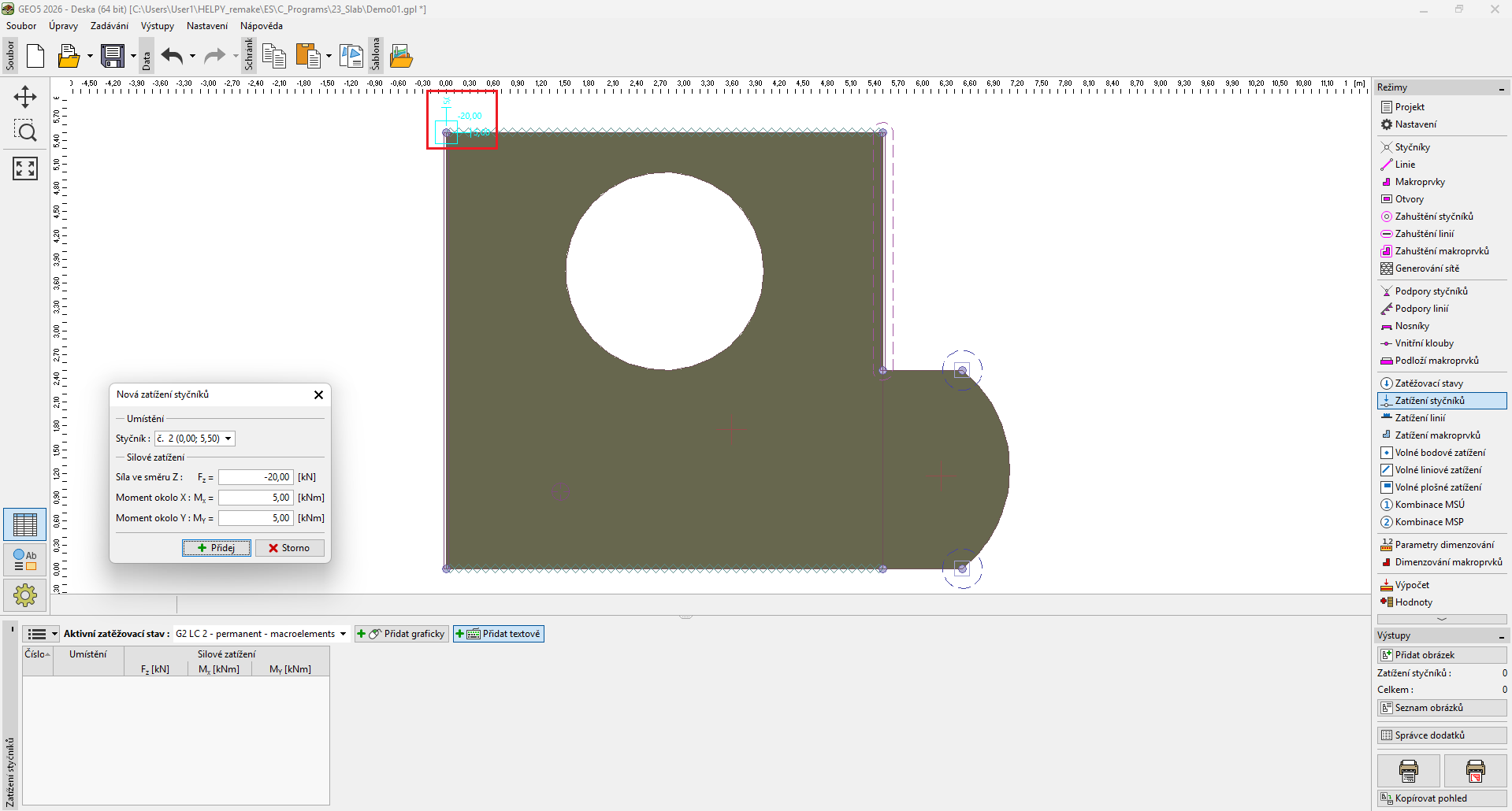 Rám "Zatížení styčníků" obsahuje tabulku se seznamem zadaných zatížení styčníků. Každé zatížení styčníků je přiřazeno zatěžovacímu stavu a některému ze zadaných styčníků. Výběr zatěžovacího stavu se provádí nad tabulkou v rozbalitelném seznamu "Aktivní zatěžovací stav". Přidání zatížení se provádí v dialogovém okně "Nová zatížení styčníků".
