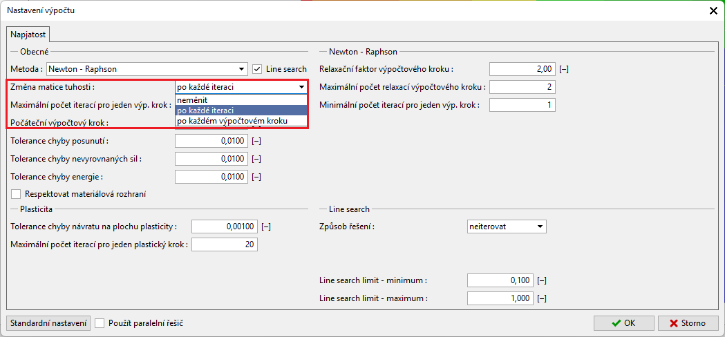Jednotlivé postupy lze zvolit v základním okně "Nastavení výpočtu" v sekci "Změna matice tuhosti". Příslušná nastavení odpovídají: