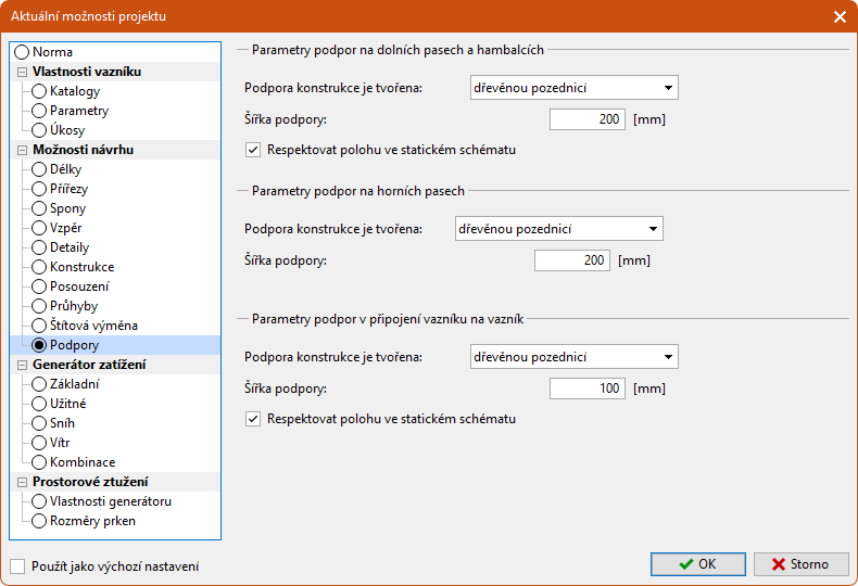 V této části lze ovlivnit, jaký typ podpor bude program automaticky přiřazovat nově vytvářeným vazníkům. Rozsah vlastností podepření odpovídá možnostem záložky "Pozednice" v okně "Vlastnosti styčníku". Styčníky s podporou jsou rozděleny do tří skupin: